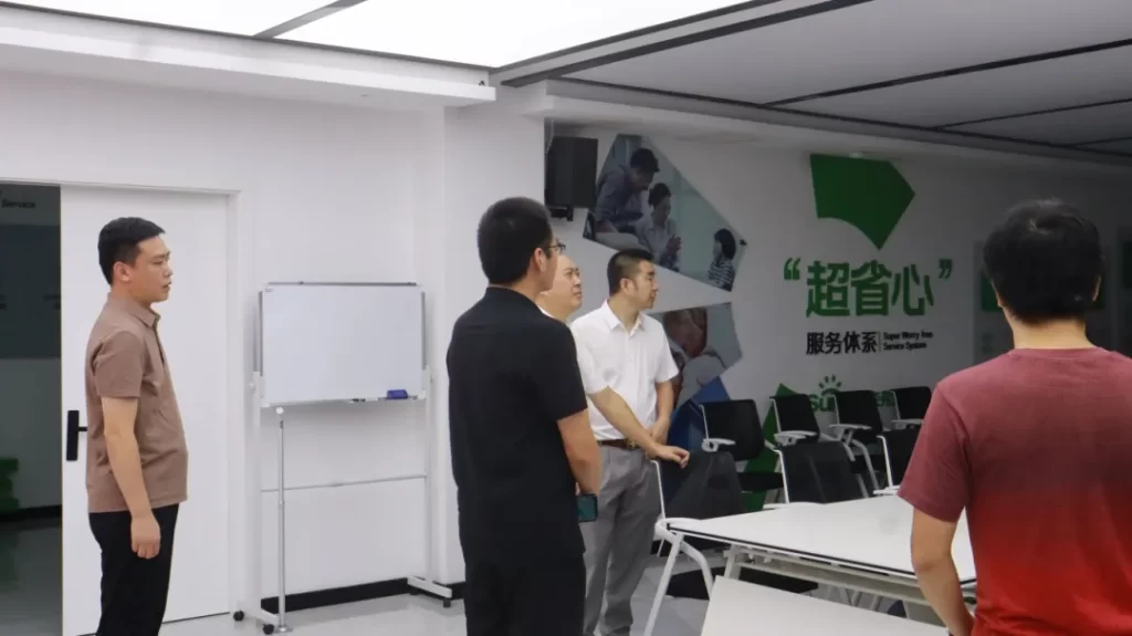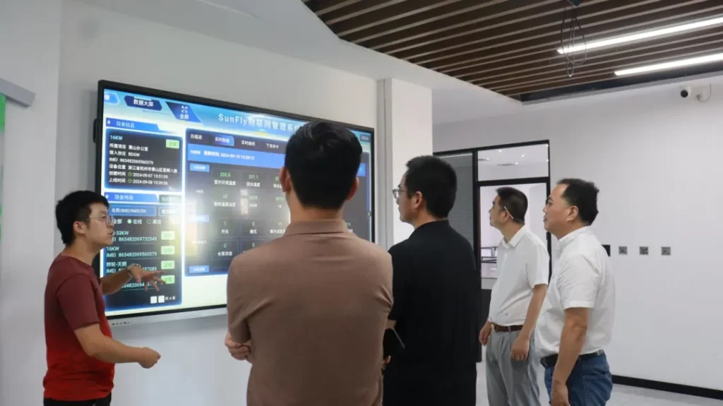 SUNFLY Chairman Jiang Linghui warmly welcomed the leaders of Yuhuan City and introduced SUNFLY’s cultural wall, system exhibition wall, IoT management system, as well as the latest technologies and products. During the visit, Chairman Jiang Ling will give a detailed report on the company’s current development status, core business and advantages, future development plans, and other aspects.